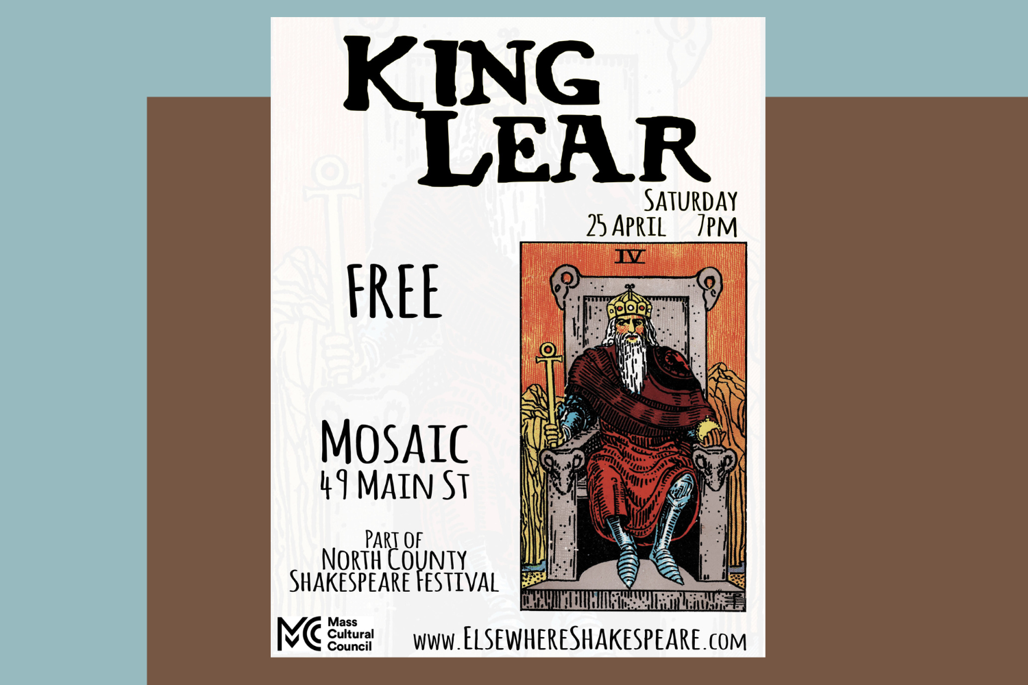 North County Shakespeare Festival: King Lear at Mosaic Saturday, April 25, 2026 7:00 PM 9:00 PM Mosaic 49 Main Street North Adams, MA, 01247 United States (map) Google Calendar ICS Come see King Lear at Mosaic Event Space (49 Main St, North Adams)Shakespeare’s tragedy of family relationships and elder abuse. Lear was our second show ever and we’re excited to take another swing at it.