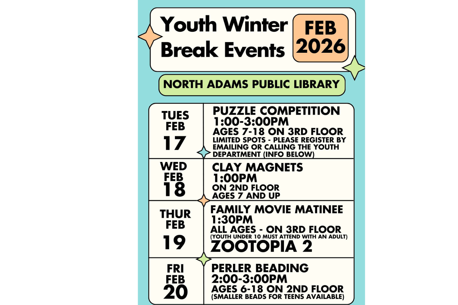 North Adams Public Library is offering daily activities from puzzle competitions, clay magnets, even a Family Movie Matinee!